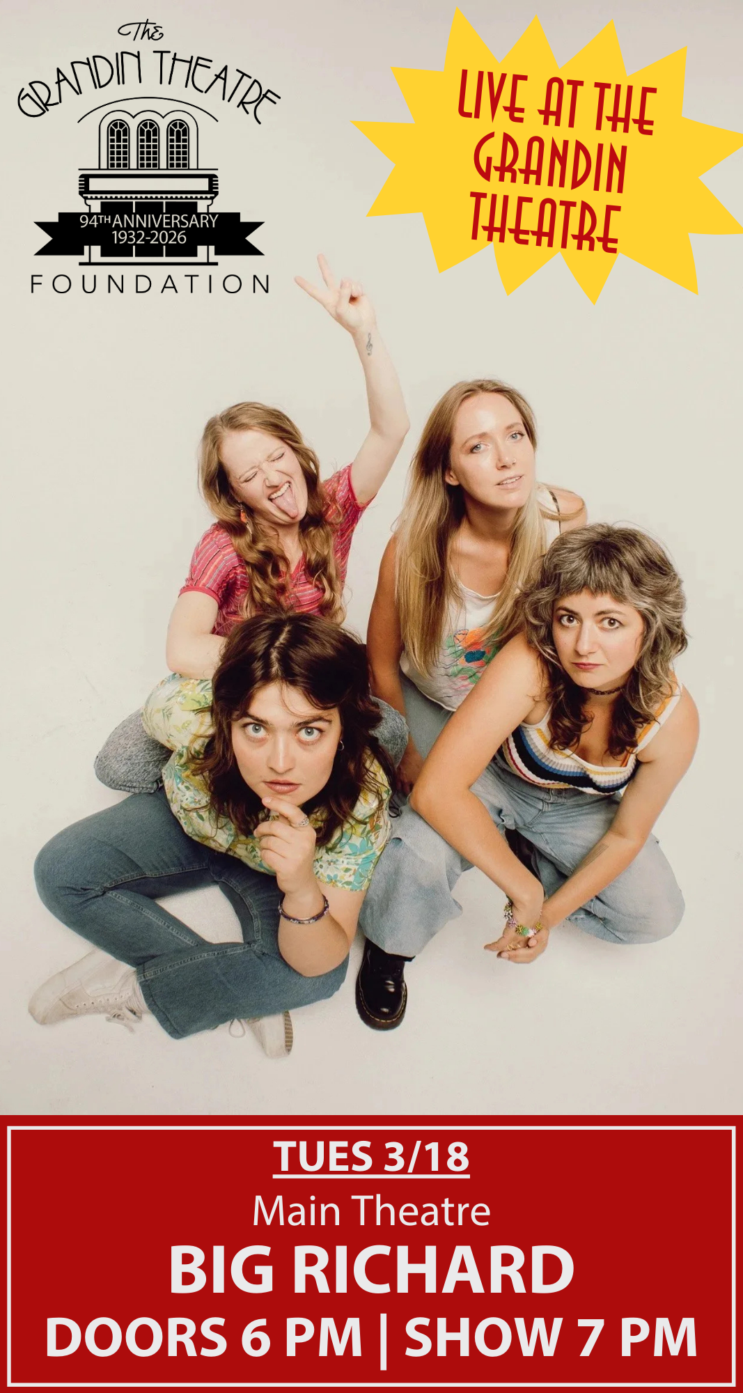 Buy Tickets TONIGHT 3/18 This Weekend (Friday 3/20 - Sunday 3/22) NEXT WEEK watch localbuy TICKETS THIS COMING WEEKEND See what’s playing this coming weekend! COMING SOON See what is coming soon on our screens! LIVE MUSIC The Grandin Theatre presents incredible live music events! WOMEN'S HISTORY MONTH SERIES Our 4th Annual celebration of women in the cinematic arts! AFTER HOURS SERIES Saturday nights at 10 pm! Join us for our edgier second-run shows! ART HOUSE SERIES Select Mondays at 6 pm for $6!! CLASSICS FILM SERIES Second Saturday of every month at 10 am for FREE! COMEDY Comedy in the Main Theatre is a truly hilarious experience! FAMILY FILMS Films that are fun for all ages! FOREIGN FILMS The world in film brought to your seat! COMMUNITY PICKS SERIES Come see what our community is screening at the Grandin! HOOT AND HOLLER - STORY TELLING The most Roanoke event that we do - local folk, poignant life stories! upcoming live music events See More Live Music more than a movie theatre Visit Our YouTube Visit Our instagram Visit Our Facebook